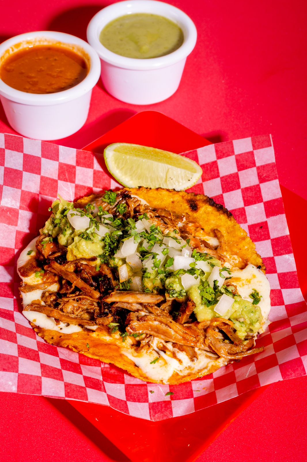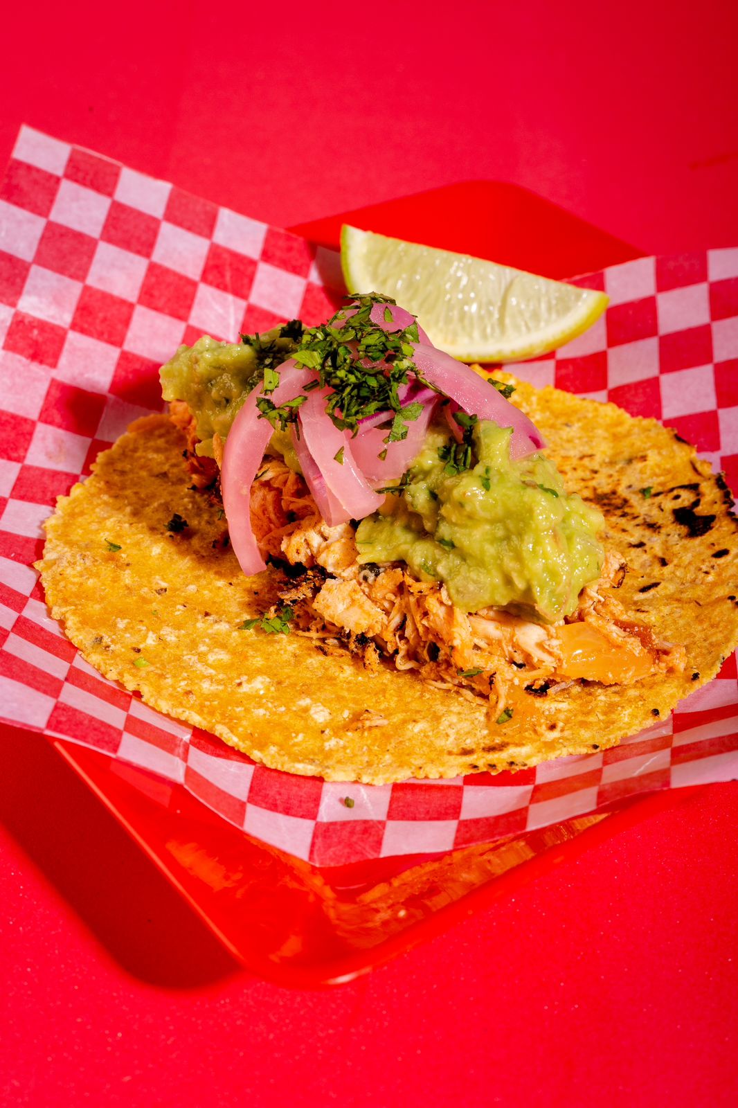 Taco de pollo desmechado acompañado de guacamole y cebolla roja encurtida, elegir salsa de la casa.