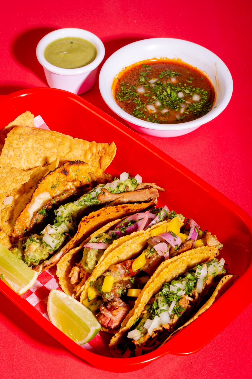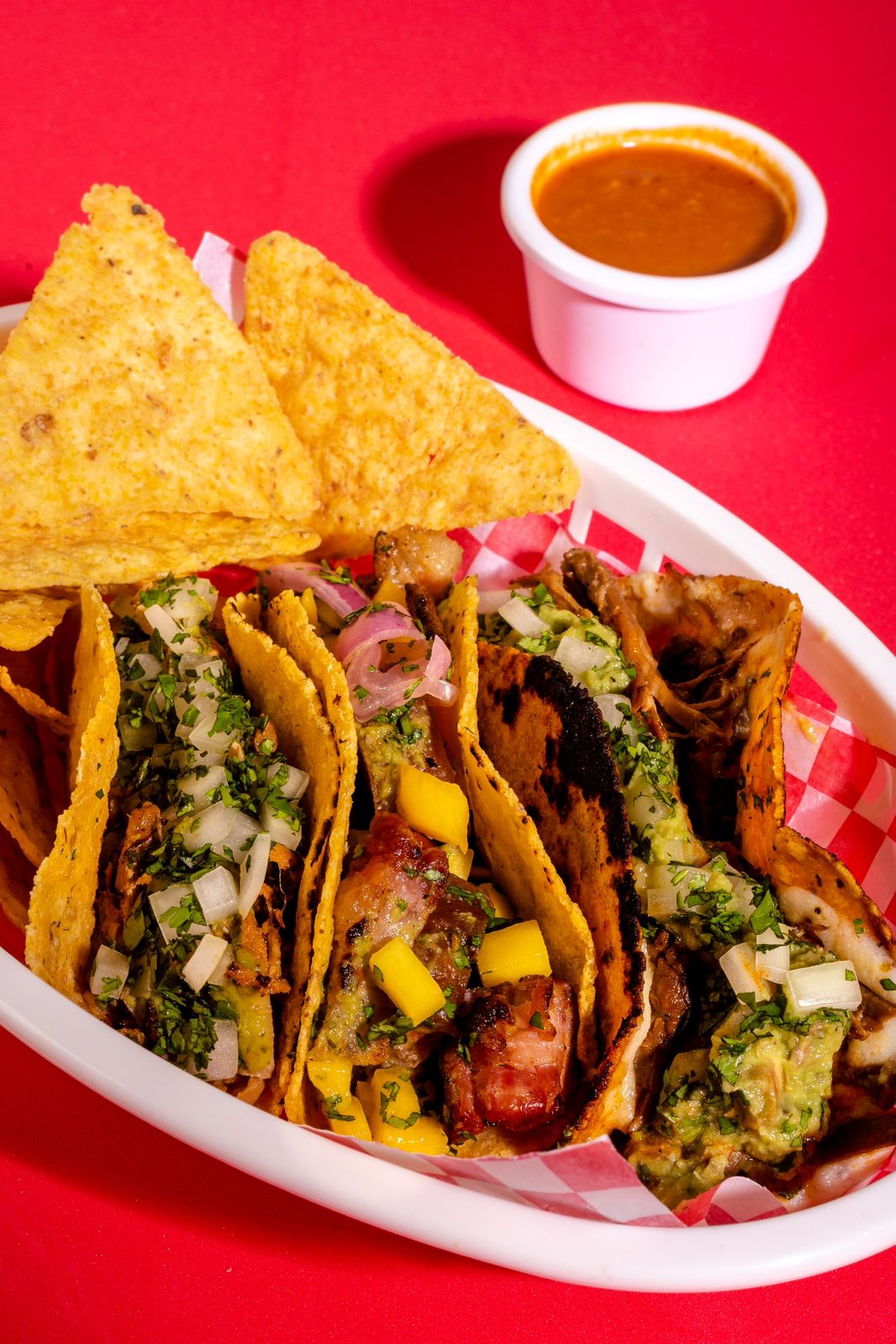 Taco de chicharron al barril, acompañado de un acevichado de mango en cebolla roja encurtida y cilantro, elegir salsa de la casa