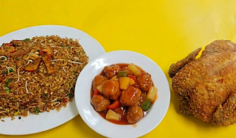 1 Caja grande con arroz chino, 1/2 caja de croquetas de pollo agridulce y 8 presas de pollo.