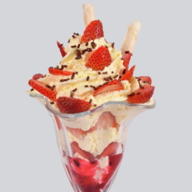 Contiene : Dos sabores de helado , duraznos , fresas , barquillo salsa y chantillyn