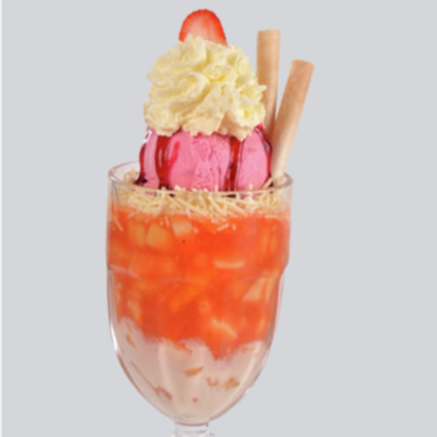 Contiene dos sabores de helado , gelatina de diferentes sabores , barquillo , salsa y chantilly