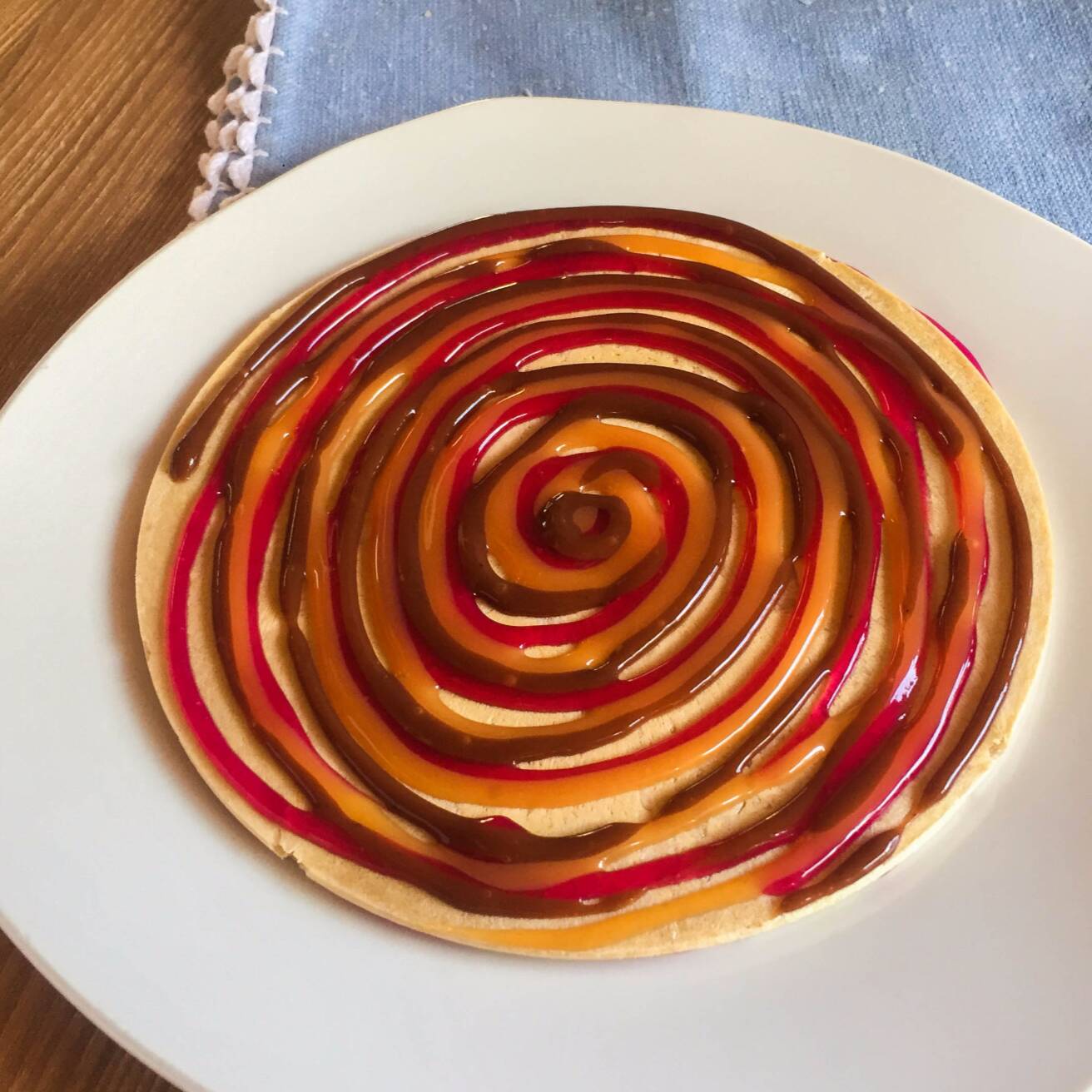 Crepe caliente con una bola de helado sabor vainilla, banano picado, crema tipo nutella, crema chantilly y salsas.
