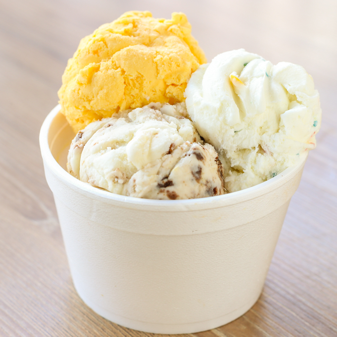 3 sabores de helado, con ron pasas, veteado de mora y mandarina, crema chantilli, mango picado, manzana en trozos, salsa de mora, barquillo y cereza.
