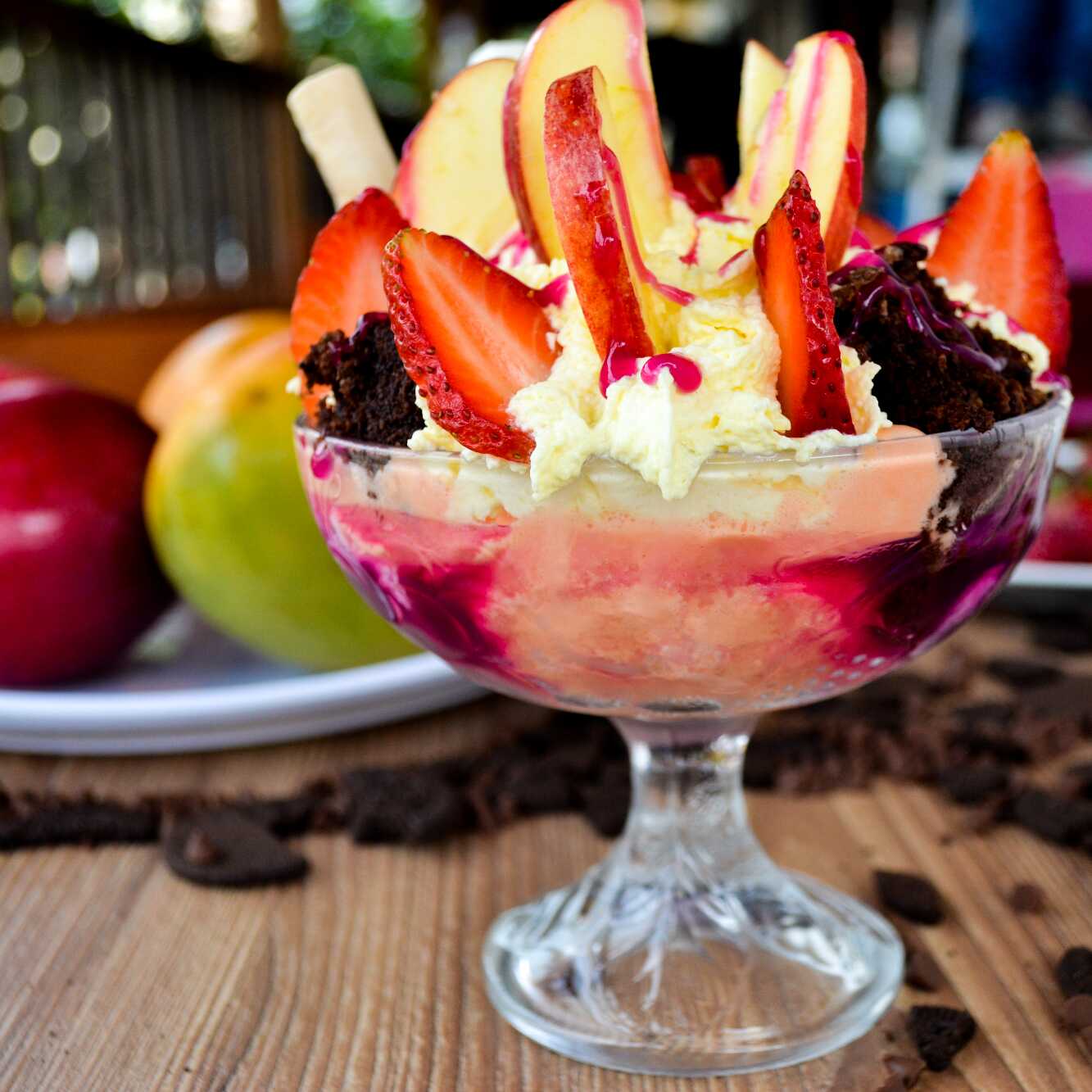 3 sabores de helado, veteado con mora, mandarina y frutos rojos, trozos de fresa, manzana, brownie, crema chantilly, salsa de mora, barquillos y cereza.