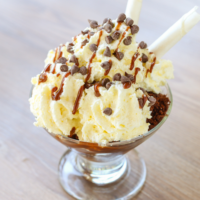 4 bolas de helado, chocolate (2), vainilla y arequipe, crema chantilly, 2 barquillos, trozos de brownie, chips de chocolate y salsa de chocolate. Contenedor de 24 onzas