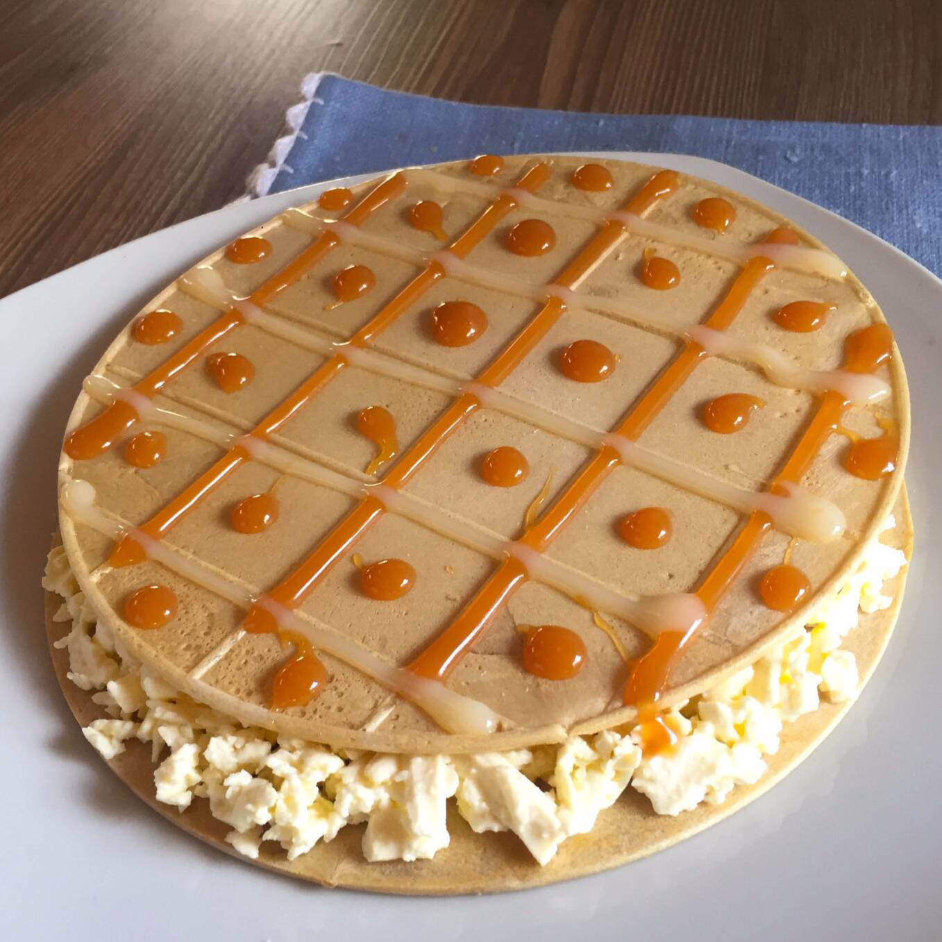 Oblea especial con queso, salsa de fresa, melocoton y chantilly.