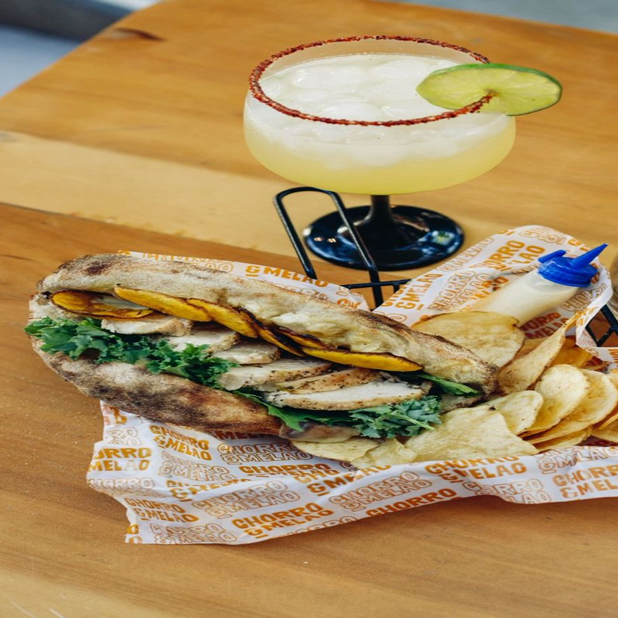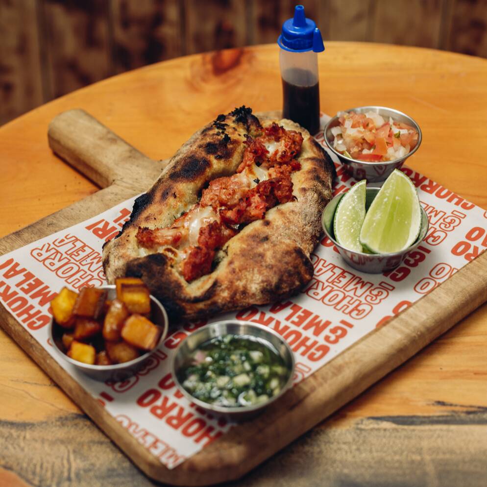 Choripan con Flow, Chorizo argentino, queso mozzarrella, chimichurri, plátano maduro con syrup de la casa, pico de gallo y limón.