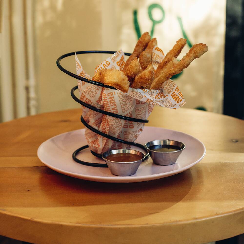Churros con Flow, apanado de la casa con canela, salsa de arequipe melao y crema de avellanas.