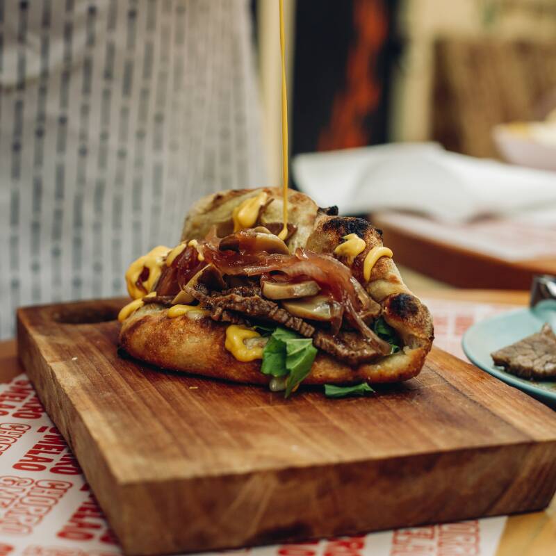 Delicioso y jugoso brisket de res, rúgula, champiñones, cebolla caramelizada, queso mozzarella y queso cheddar. Hará que te chupes los dedos