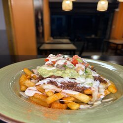 Papas a la francesa con birria, queso, sour cream, guacamole artesanal y pico de gallo.