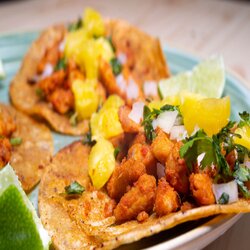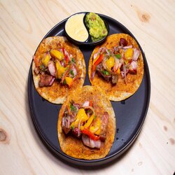 3 Tortillas de maíz con chicharrón al barril, cebolla roja, pimentón, mango y cilantro, acompañada de salsa suave de tomates con jalapeño tatemados más salsa de maracuyá.