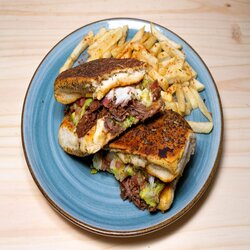 Pan cubano de 15cm con birria, queso, lechuga, pico de gallo y guacamole, acompañado de caldo de birria con papas a la francesa.