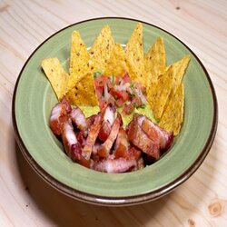 Chicharrón al barril acompañado de guacamole artesanal, pico de gallo y nachos.