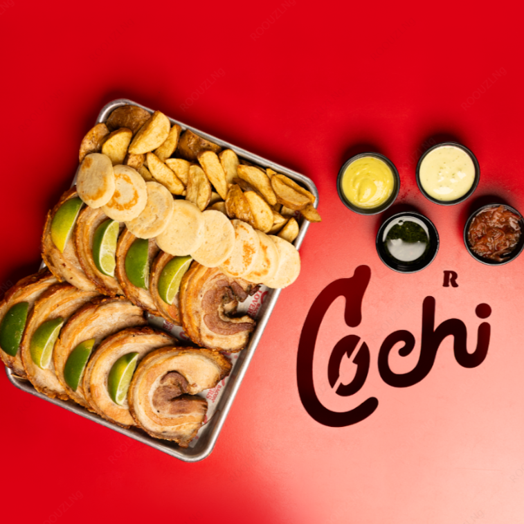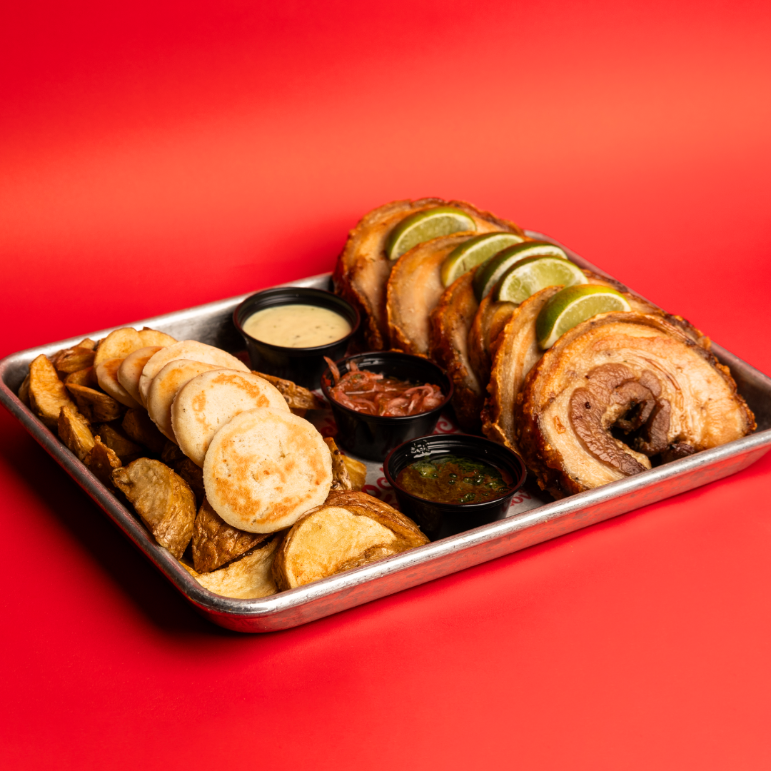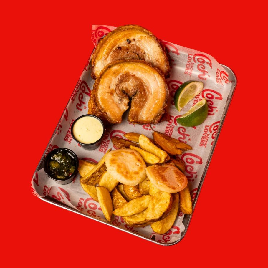 500 gr de tocino al Horno, papas a tu eleccion, 8 arepas de queso, incluye todas las salsas (salsa de la casa, chimichurri y tipo ceviche)(2-3 personas)