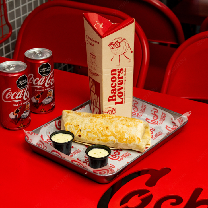 Tocino elaborado en caja china, frijol refrito con carne molida, maduritos, guacamole especial, queso mozzarella, sour cream, lechuga y hogao.