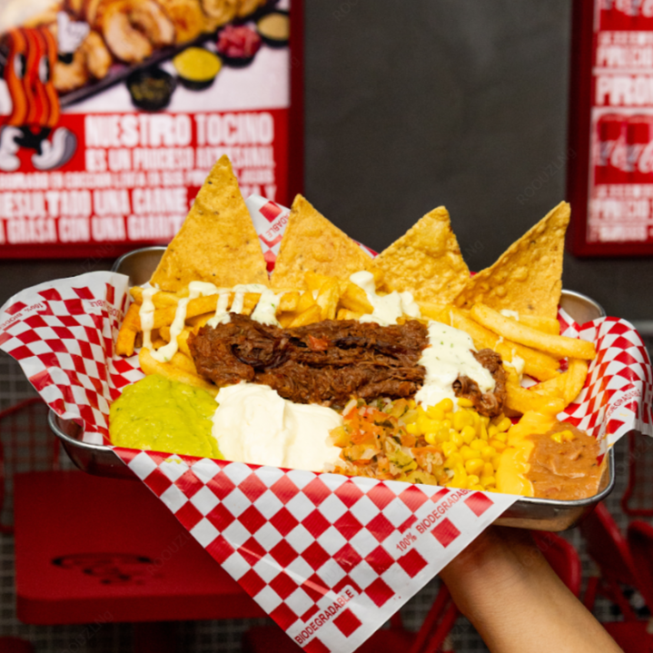 papas a la francesa bañadas con trocitos de chicharron, maduritos, sour cream, queso mozarella, guacamoles especial, hogao y nuestra salsa de la casa