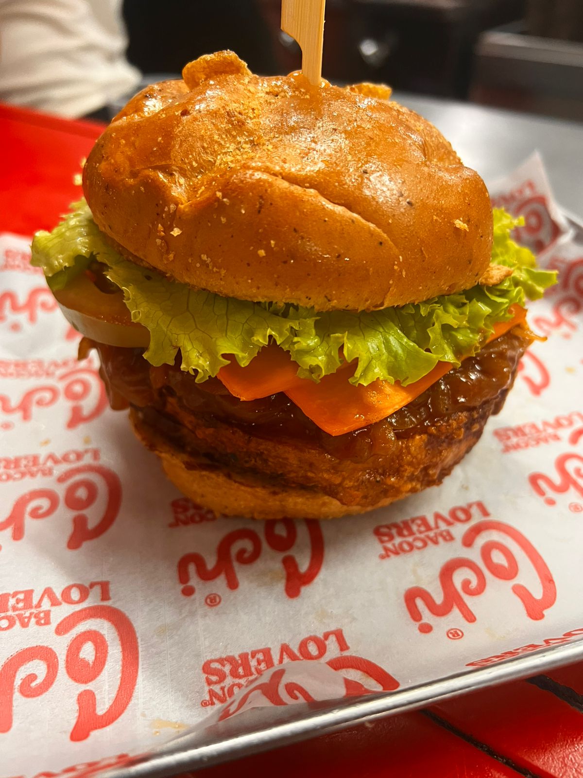 Burger con carne de porchetta (150 gramos ), rodaja de porkchetta, pan de chicharrón, queso chedar, cebolla caramelizada, salsa de la casa y vegetales. ( lechuga tomate cebolla caramelizada).