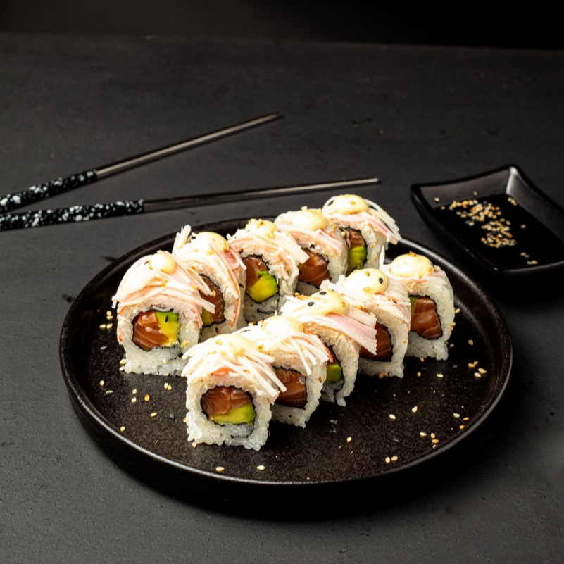 SUSHI 10 BOCADOS , CON SALMON FRESCO , QUESO CREMA , AGUACTE , TOPPING DE KANIKAMA Y SALSA FUJI