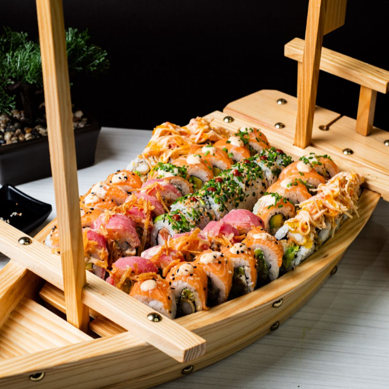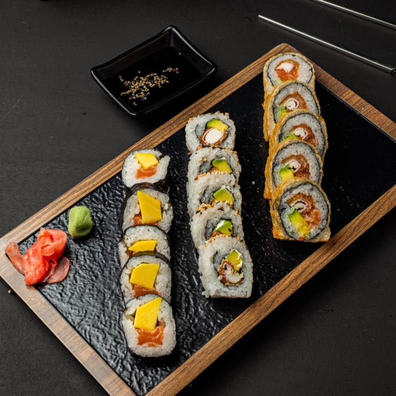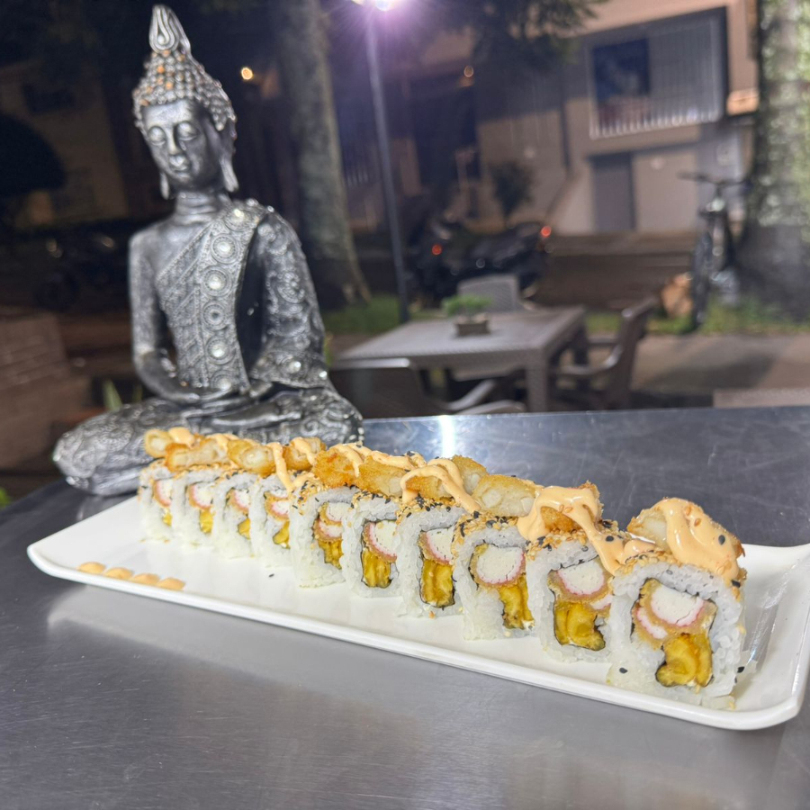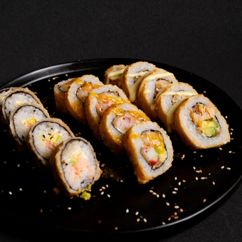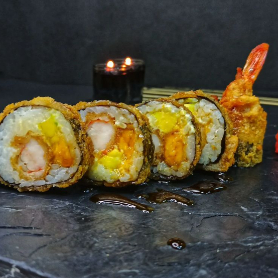 10 BOCADOS DE SUSHI , CON CAMARONES , AGUACATE , PLATANO MADURO SUSHI APANADO , CON SALSA FUJI ,