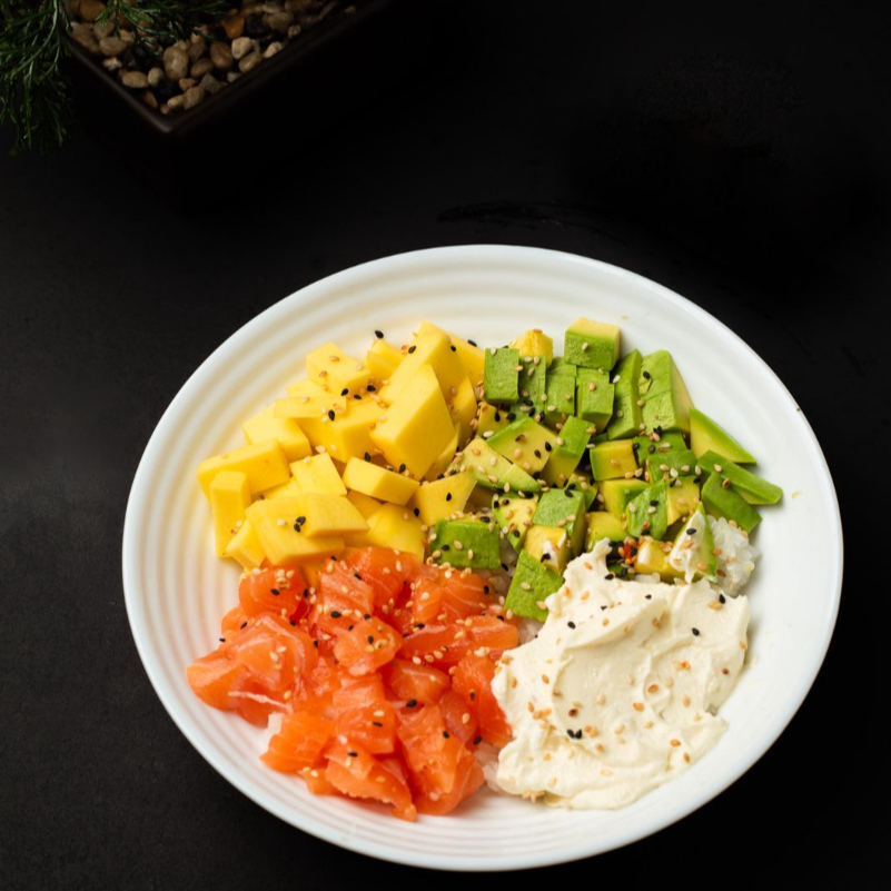 poke de salmon con , 120 gramos de salmon , aguacate , mago , y queso crema y ajonjoli