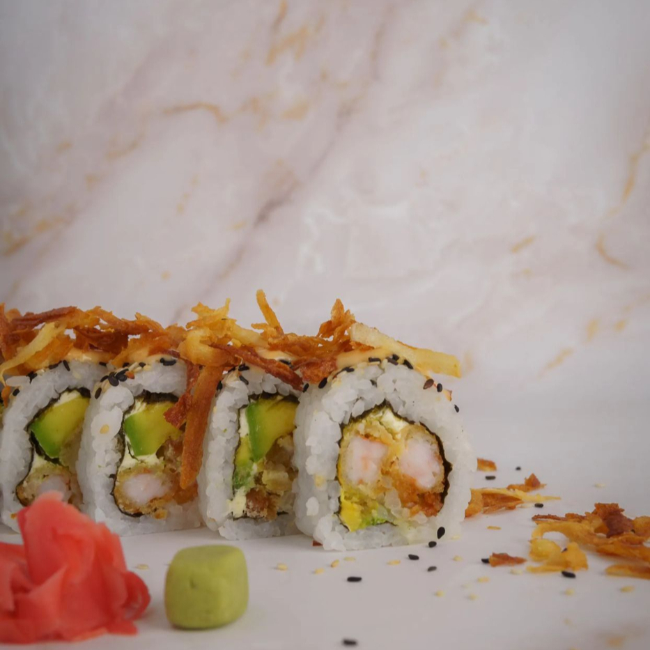 1O BOCADOS DE SUSHI , CON QUESO CREMA AGUACTE CAMARON CROCANTES , AJONJOLI , TOPPING DE MAYOSIRASHA , Y YUCA CROCANTE