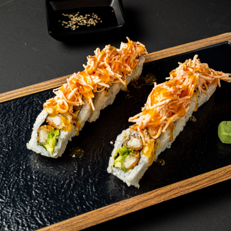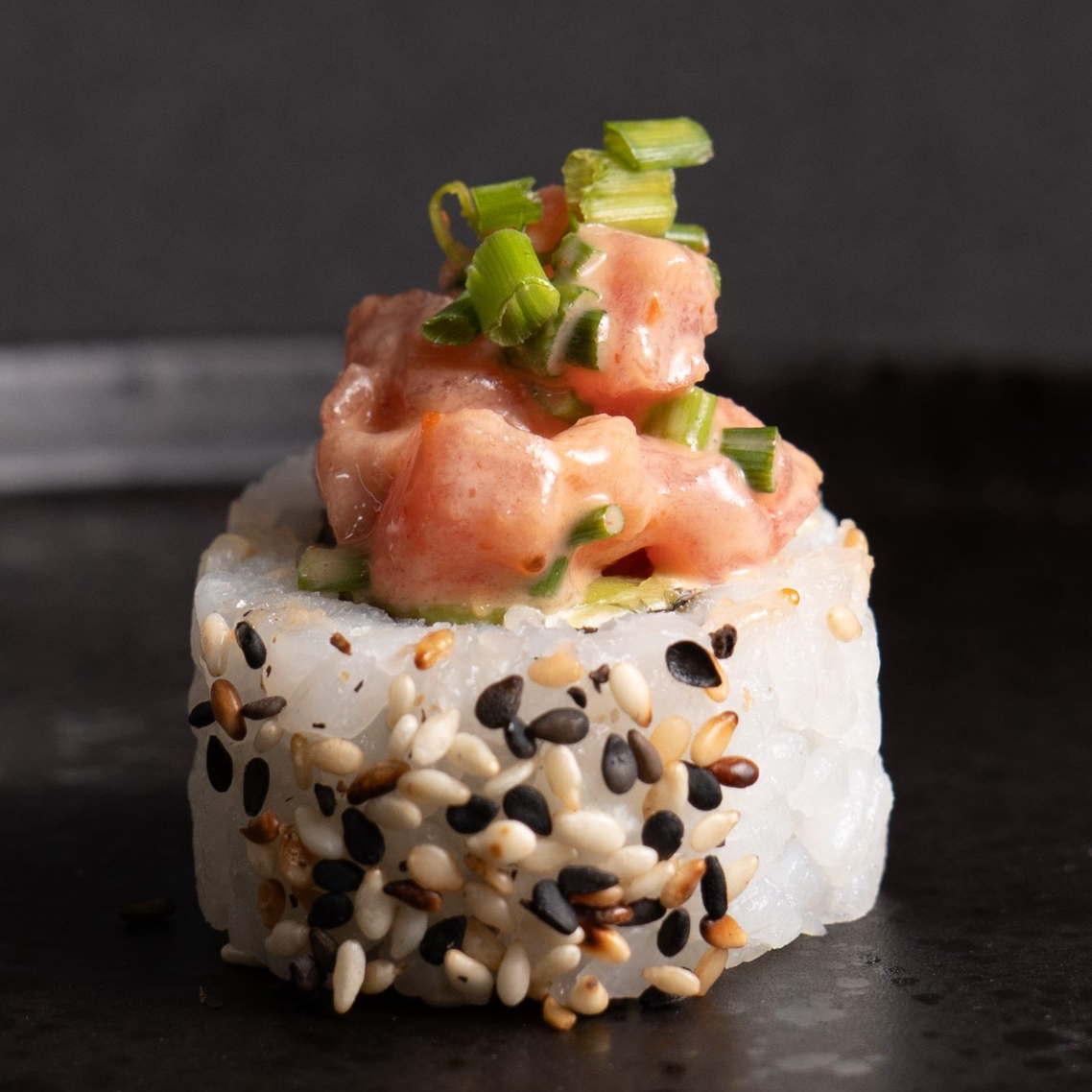 10 BOCADOS DE SUSHI , CON CAMARONES TEMPURA , QUESO CREMA AGAUCATE , AJONJOLI , TOPPING DE TARTAR DE ATUN PICANTE Y CEBOLLIN