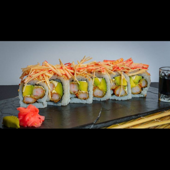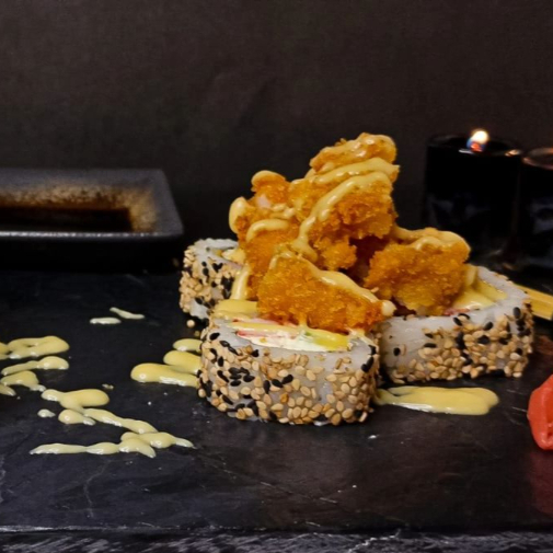 10 BOCADOS DE SUSHI , CON TILAPIA TEMPURA , AGFUACTE , QUESO CREMA , Y AJONJOLI CON TOPPING DE ENSALADA DINAMITA , Y SALSA UCHUVA