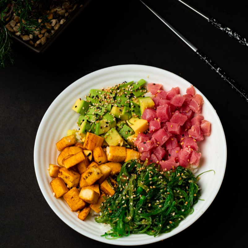 poke de atun , arroz de sushi , 120 gramos de atun , wakame platano maduro . aguacate , y ajonjoli