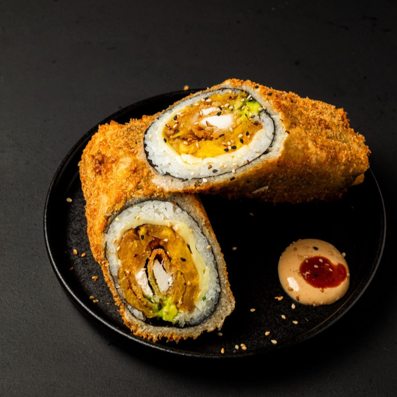 sushi burrito apanado con , pollo apanado queso mozarella , aguacate , platano maduros y salsa mayosirasha