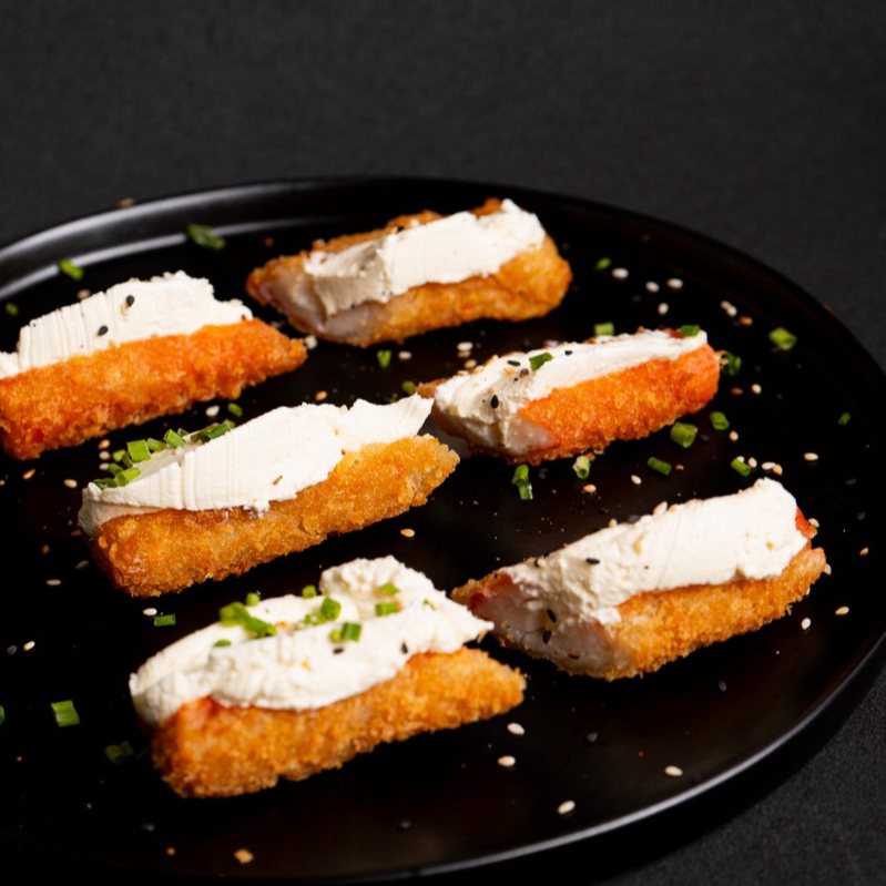 lleva tres unidades de palmitos crocantes , con queso crema y ajonjoli