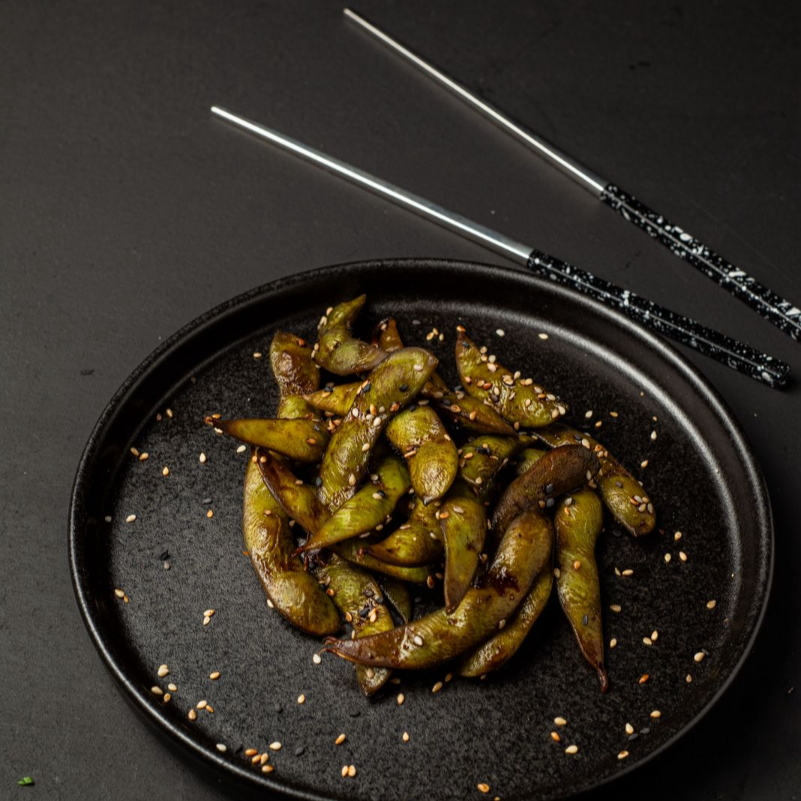 lleva 100 gramos de edamames salteados con salsa de soya