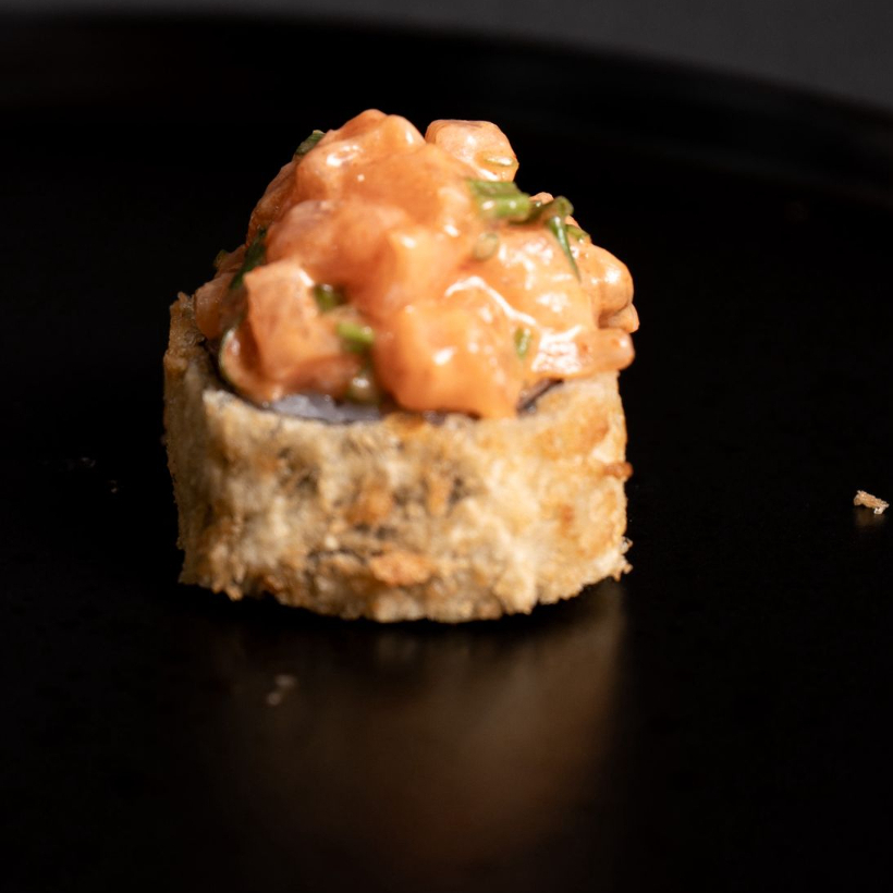 SUSHI 10 BOCADOS , QUESO CREMA , AGUACATE , PALMITO CROCANTE , SUSHI APANADO , CON TARTAR DE SALMON PICANTE