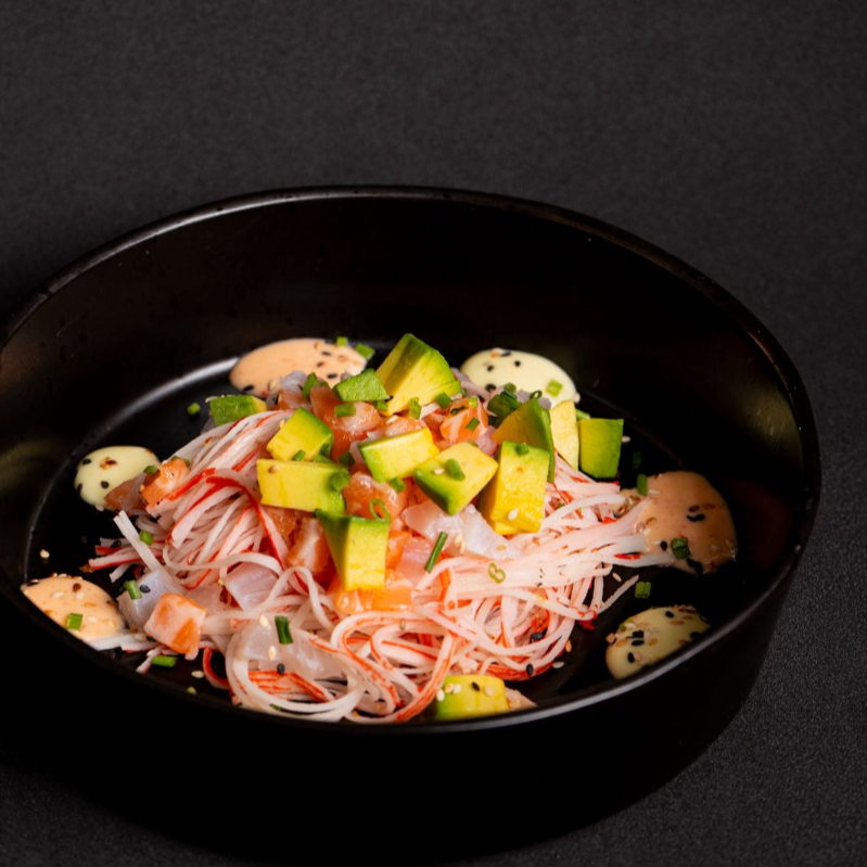 ensalada de kanikama , con cortes de mix de salmon tilapia y aguacate , dos salsa de la casa