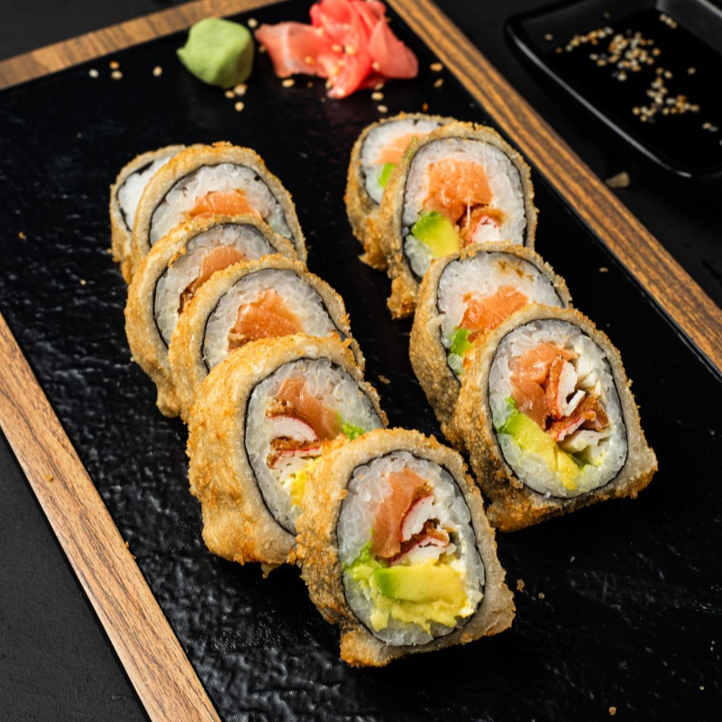 10 pz sushi apanado con salmón queso crema, aguacate , palmito y salsa teriyaki.