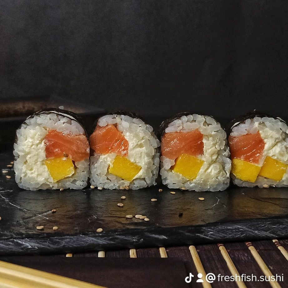 50 GRAMOS DE ARROZ DE SUSHI , SALMON FRESSCO , MANGO ,AGUACATE , QUESO CREMA , Y AJONJOLI