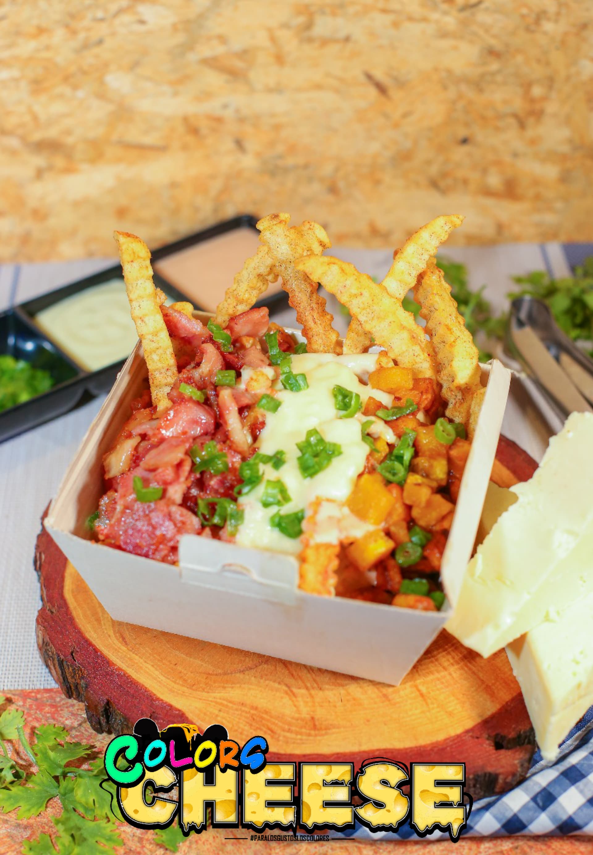 Papas a la francesa, con fondue de queso, maduro, tocineta, salsas de la casa y cebollín.