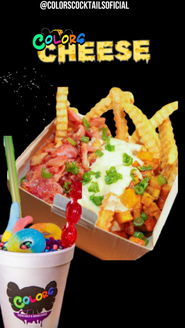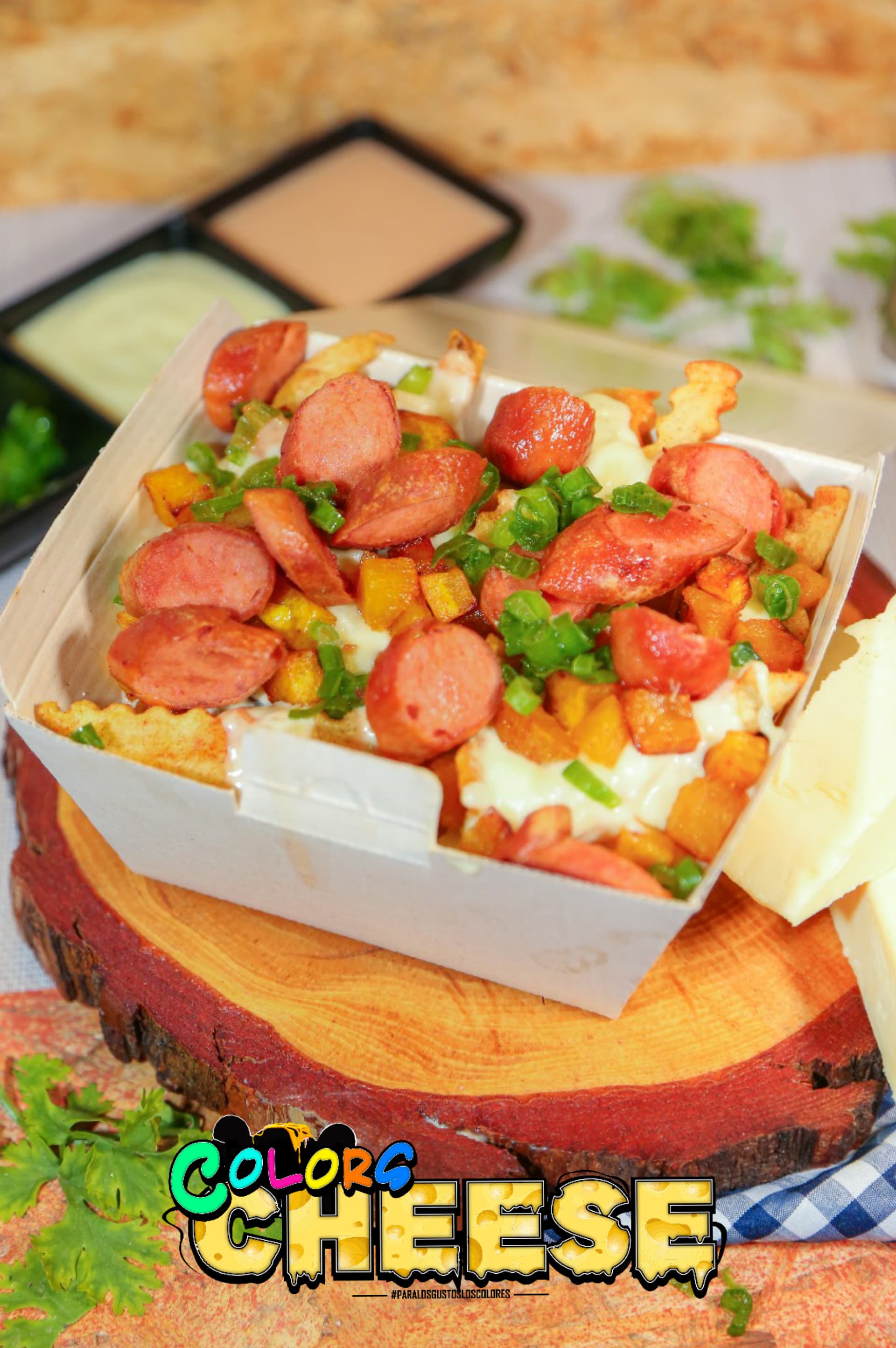 Papas a la francesa, con fondue de queso, maduro, salchicha americana, salsas de la casa y cebollín.
