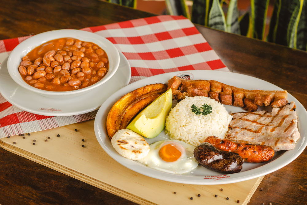 Acompañada de arroz blanco, ensalada, papas, frijoles o sopa del día y guarapo.
