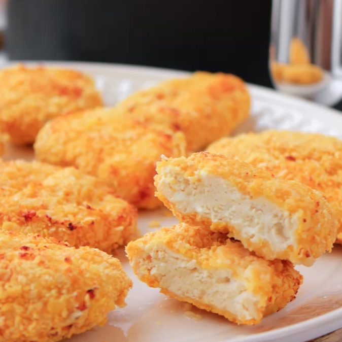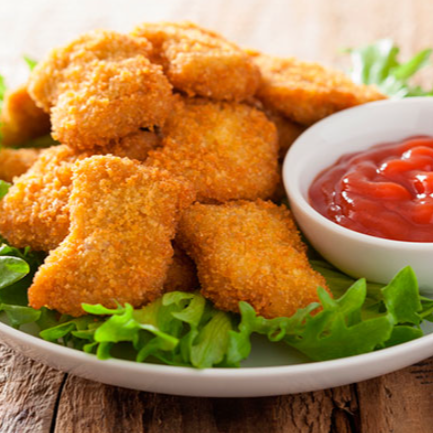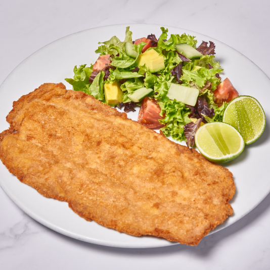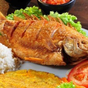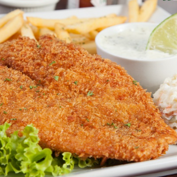 Filete de pescado marinado en limón y salsa soya, finas hierbas en un crocante empanizado, acompañado de arroz de coco, ensalada frutal, cascos de papa y patacón.