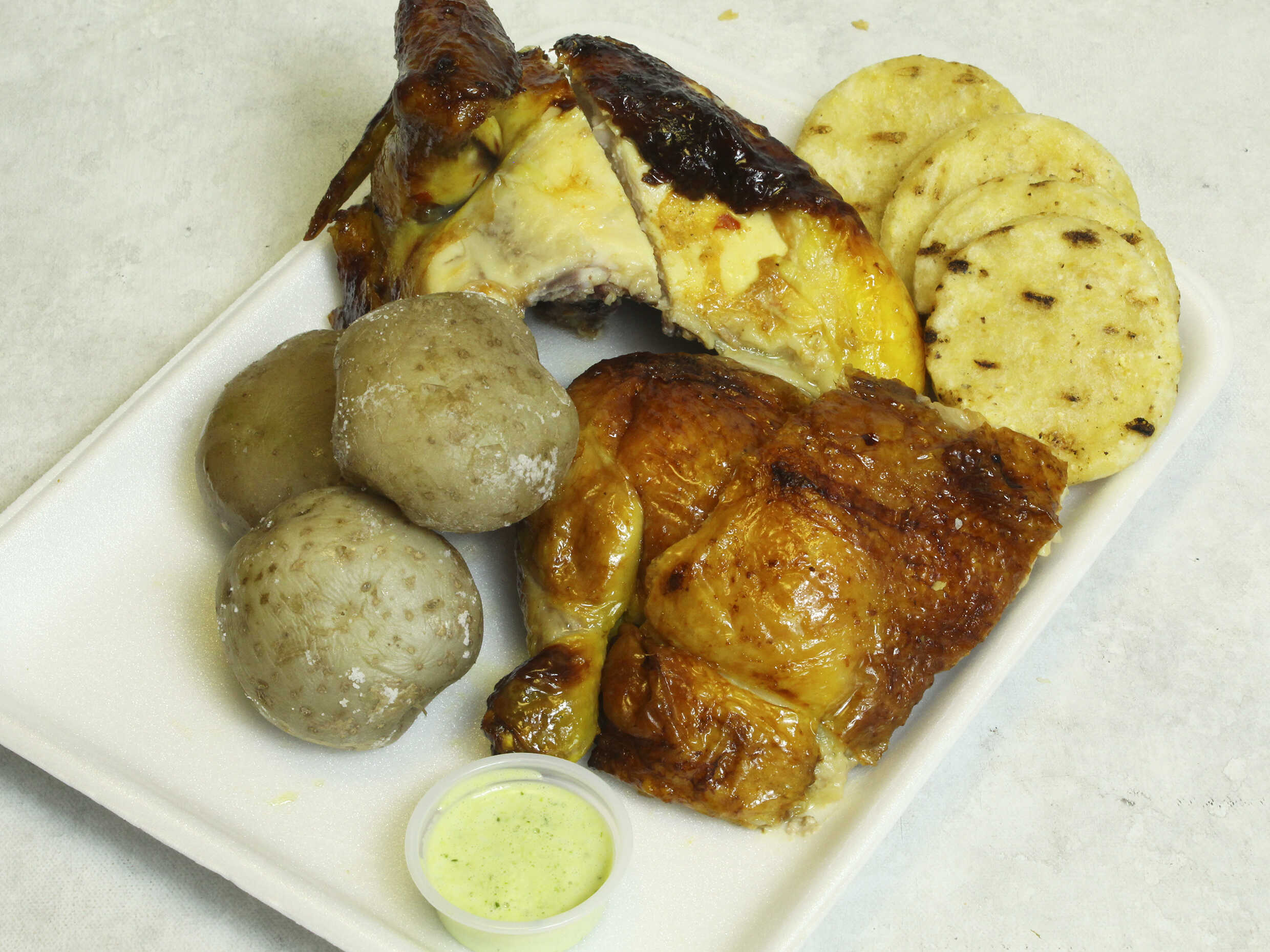Todo acompañado con papa, arepa y salsa.