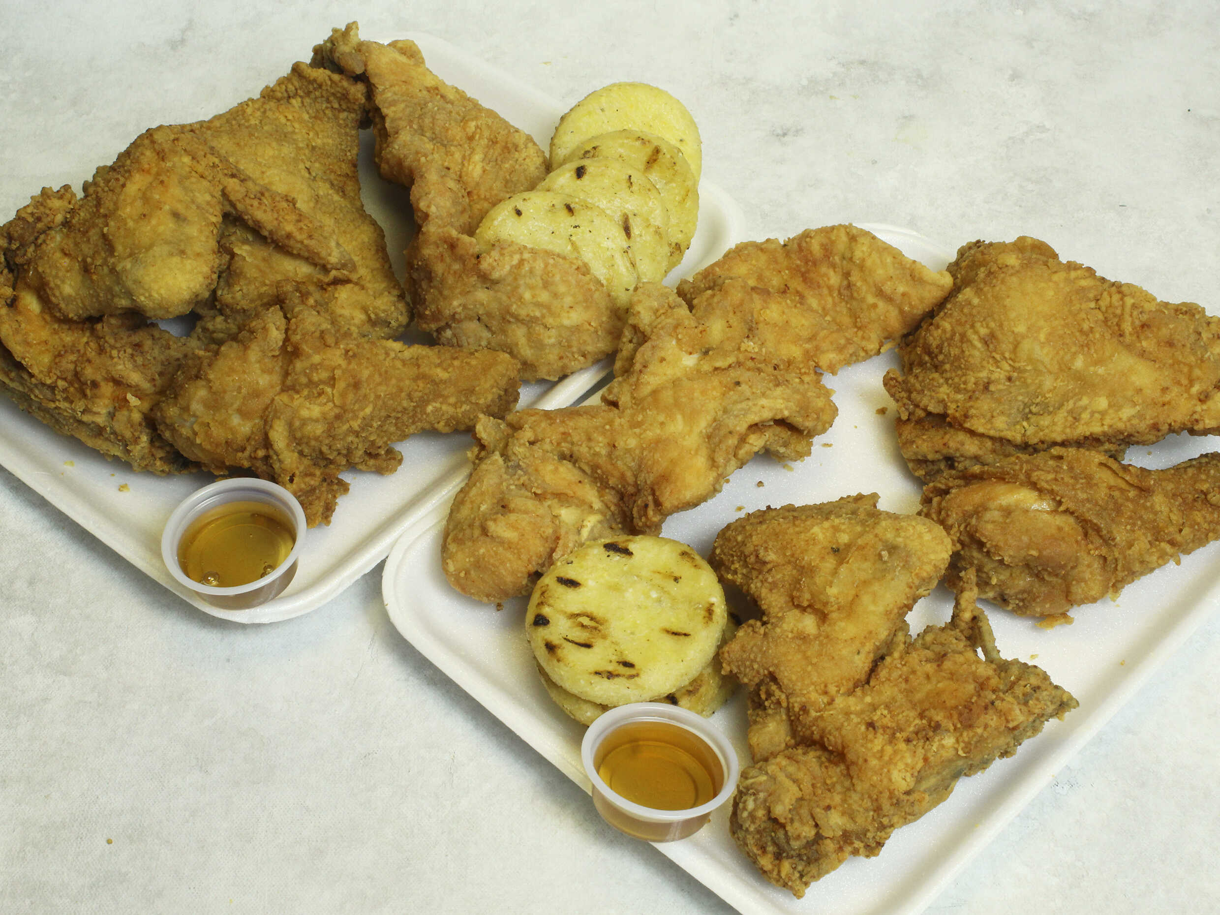 8 presas, Acompañado con 8 papas, 8 arepas y salsas. (miel o tomate)