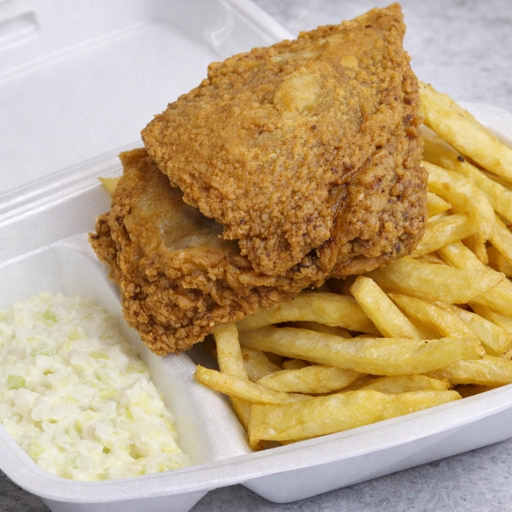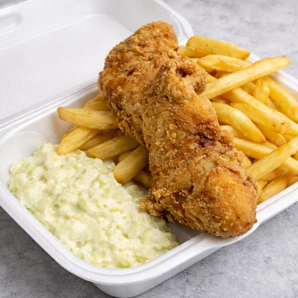Muslo apanado, papas francesa, ensalada dulce de repollo, 1 torta de pollo, arepa