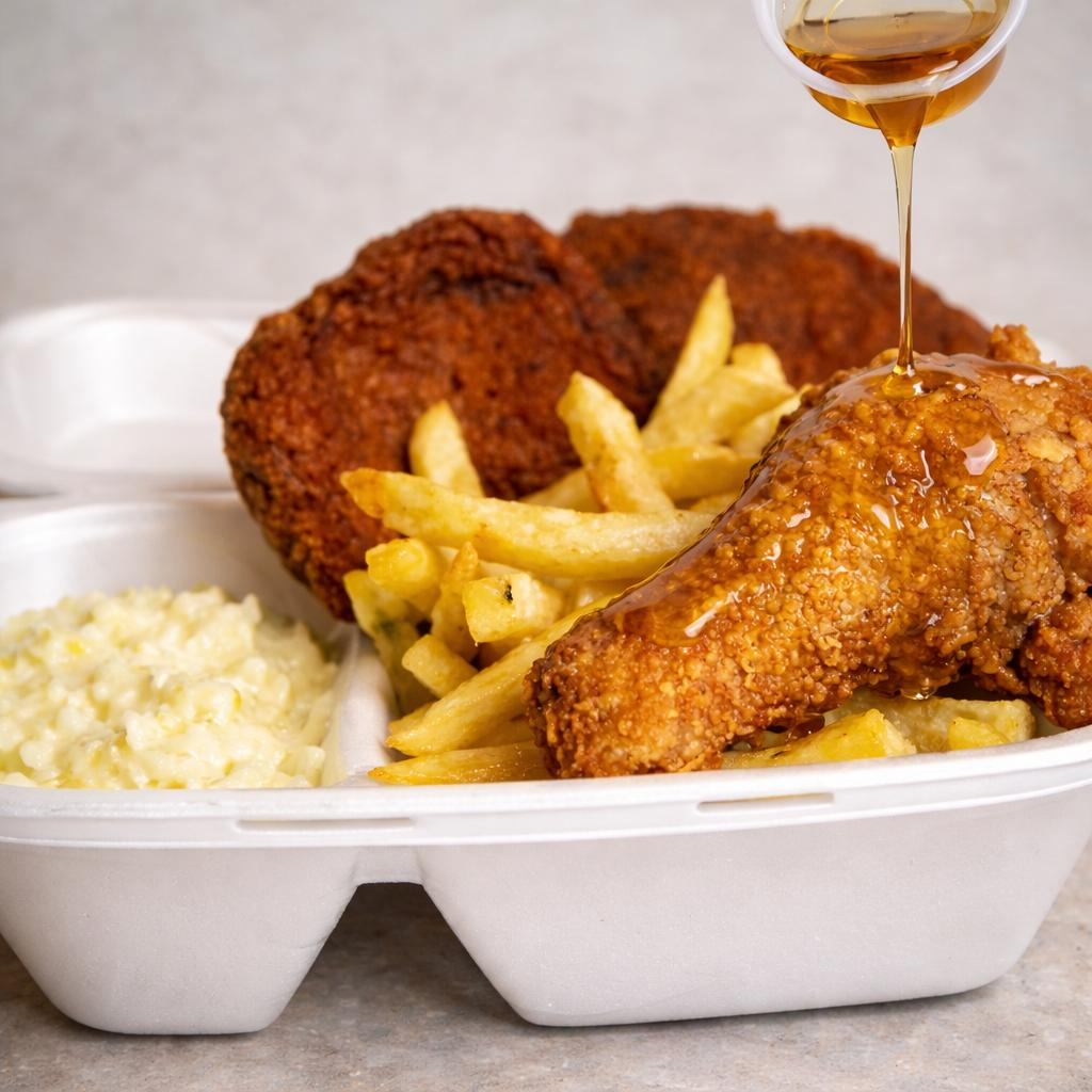 (Un solo Contramuslo apanado), porción grande de papas a la francesa, arepa, ensalda y salsas