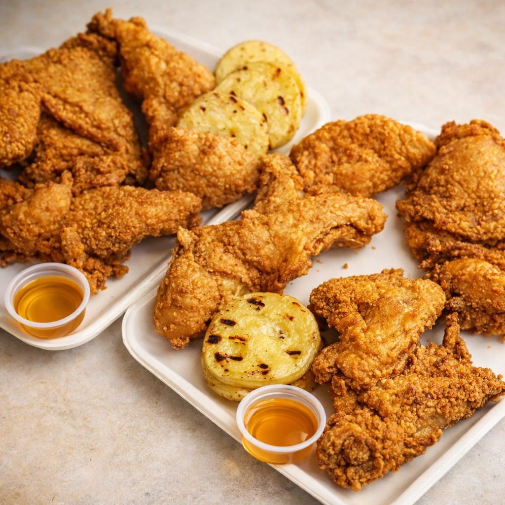 1 Ala apanada, papas a las francesa, arepa, ensalada y salsas.