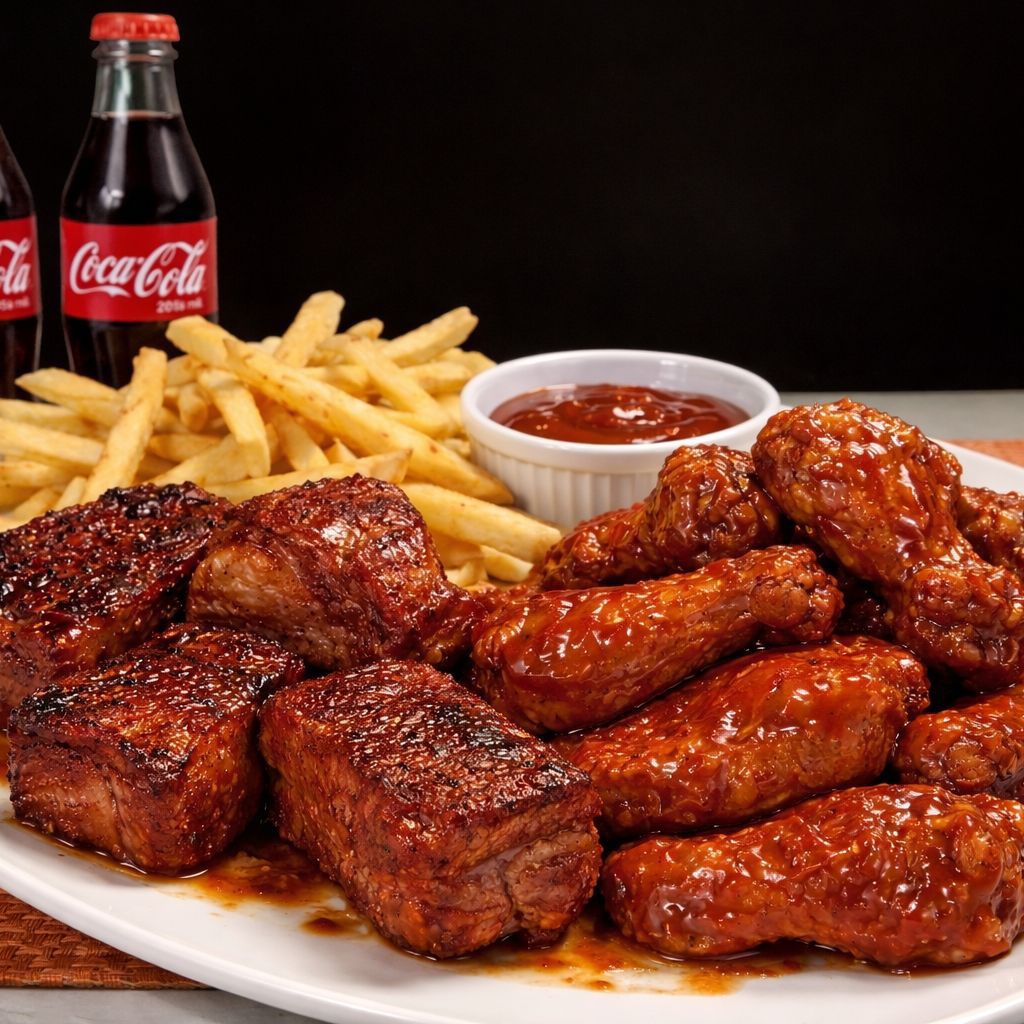 5 Alitas y 5 costillas BBQ, porción de papas a la francesa, gaseosas de 1L Coca-Cola