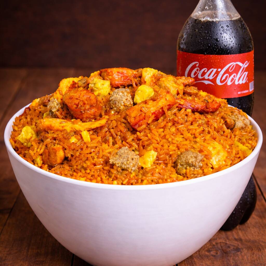 Arroz premium, Pollo, cerdo, costillas ahumada, chorizo, chicharrón, maicitos y plátano maduro, con Coca-Cola 1L