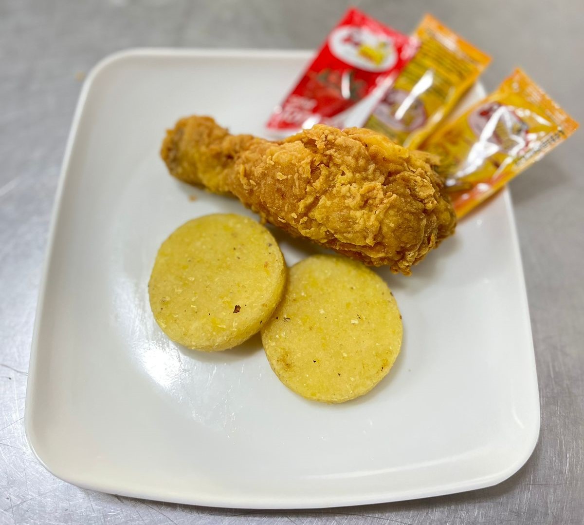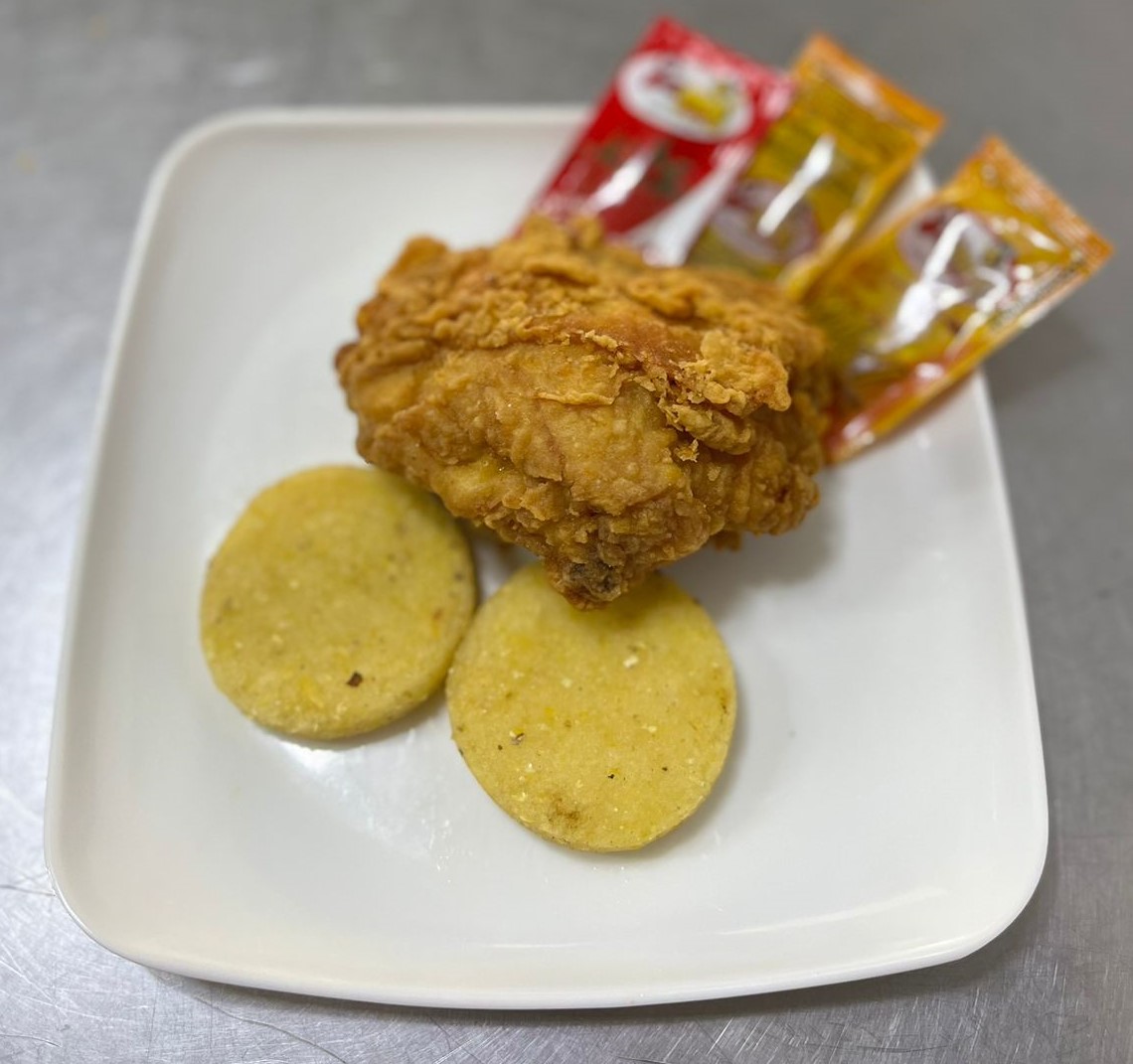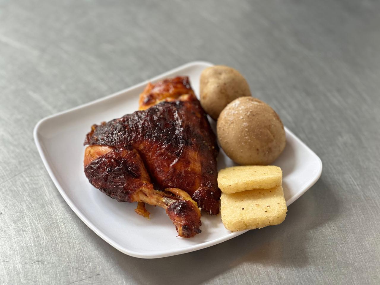 Muslo, 1 arepa y 1 papa.
