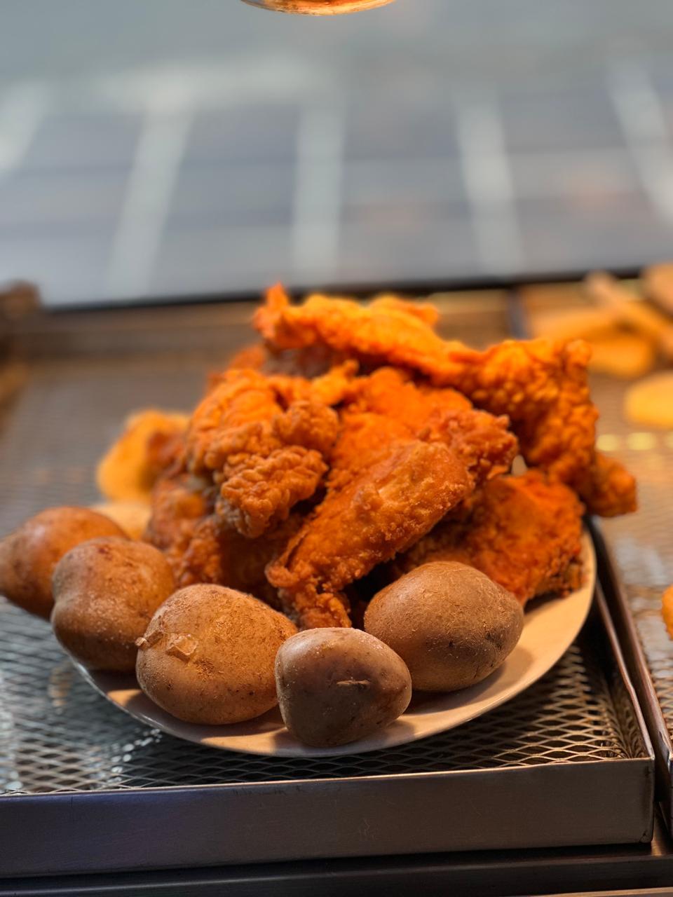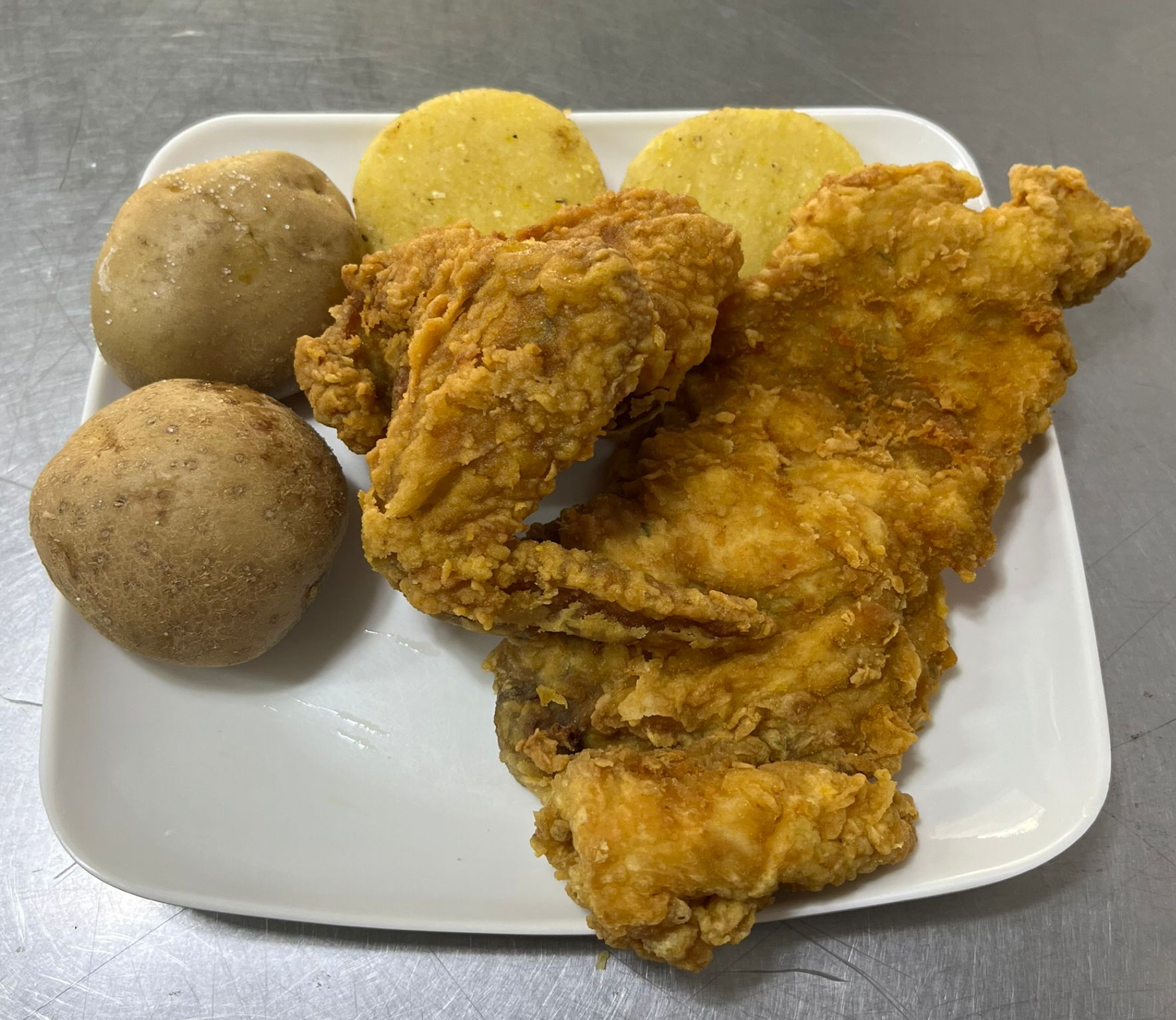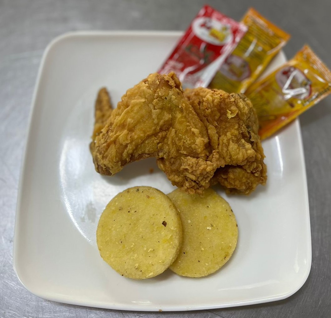 Combo de pechuga y ala apanadas, acompañadas de papas cocidas saldas y arepas 2 unidades