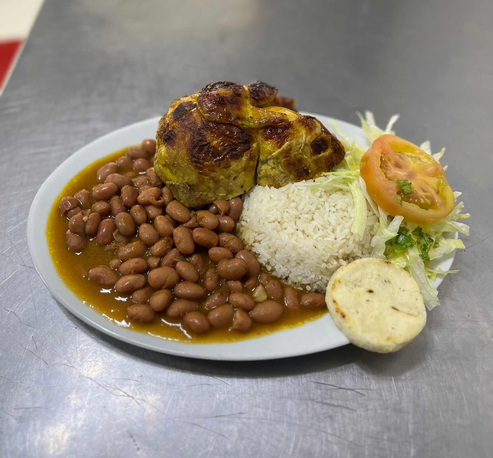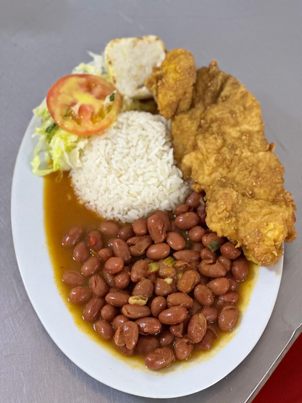 Proteína, arroz, frijoles, ensalada de la casa, arepa.