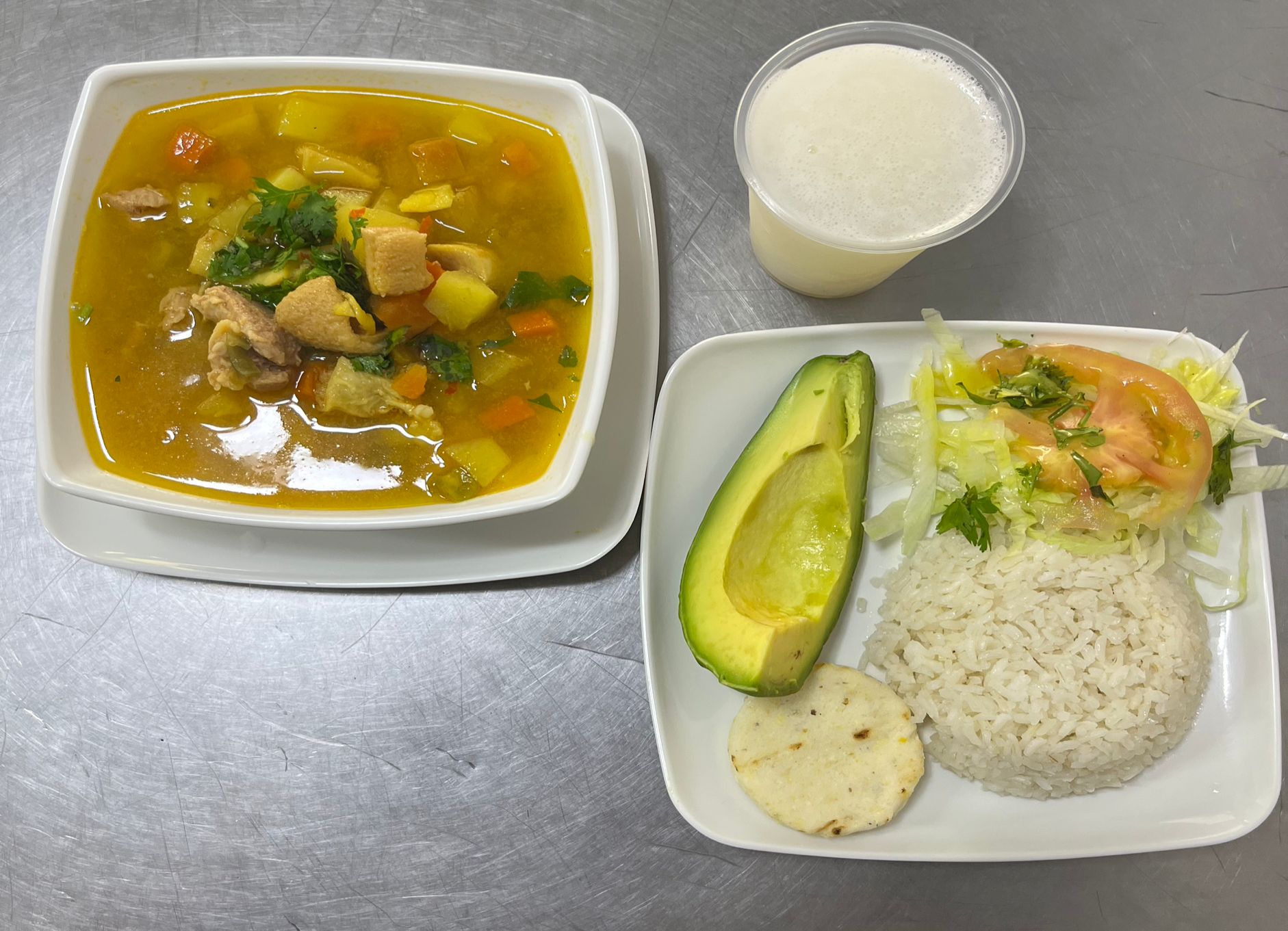Mondongo con buena presa, acompañado de arroz, ensalada, aguacate, arepa y bebida del día.